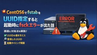 Linux 🐧 CentOS6でfstabをUUID指定すると起動時にfsckエラーが出た話(原因と対処まとめ) CentOS6.10環境でfstabをUUID指定した際に起動時fsckエラーが発生した実体験をもとに、原因と対処法を分かりやすく解説。UUIDの書き方ミスや重複、起動順序問題まで網羅。 2025.12.18 Linux