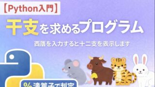 Pytyon 【Python入門】西暦を入力すると干支(十二支)を表示するプログラム|%演算子の使い方も解説 Python初心者向けに、西暦を入力すると干支(十二支)を表示するプログラムを解説。%演算子やリストの使い方、課題で減点されない書き方まで丁寧に紹介します。 2025.12.23 Pytyon