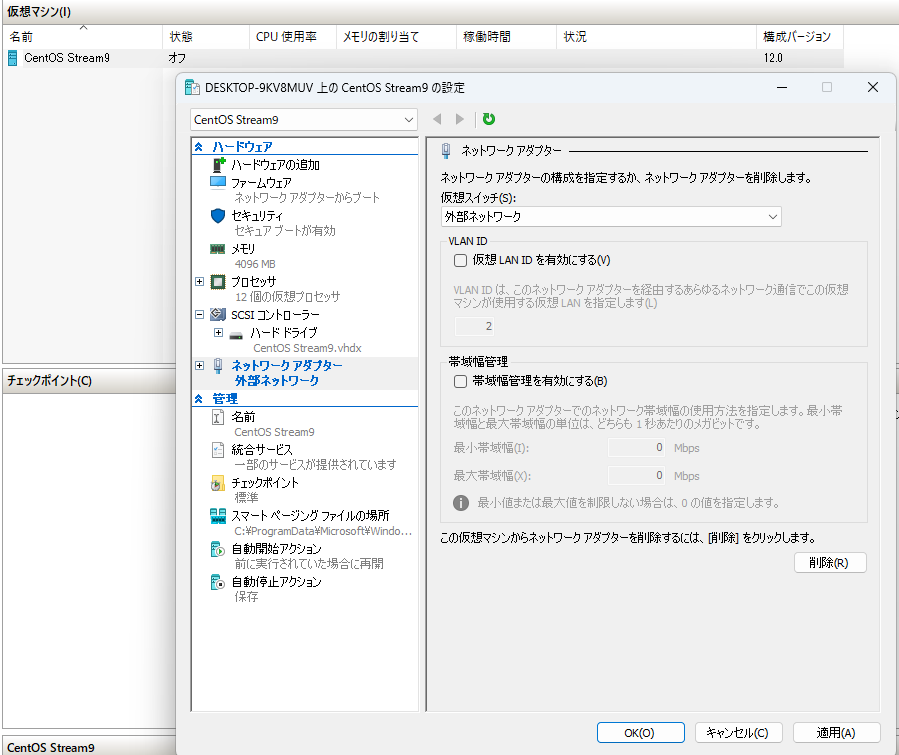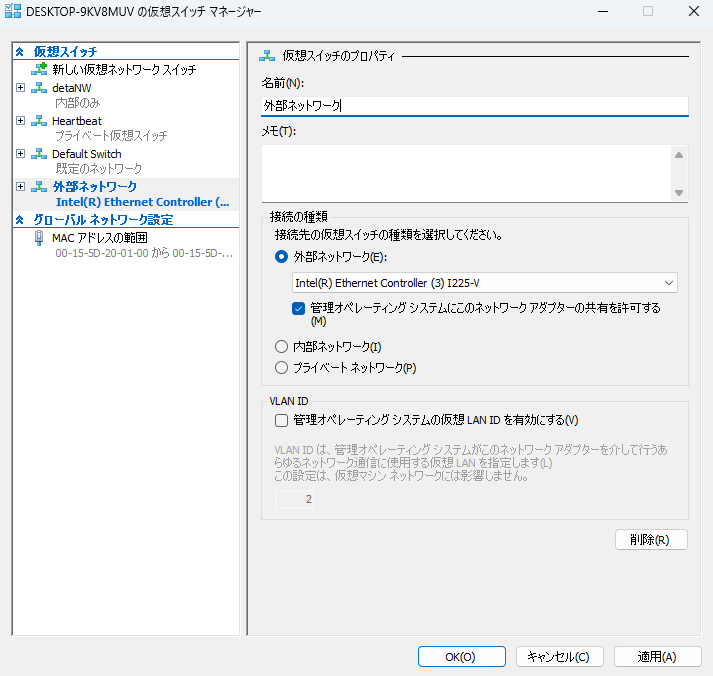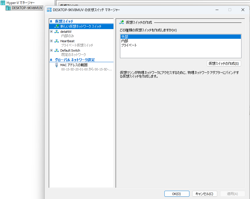 • Hyper-V マネージャー → 右側「仮想スイッチ マネージャー」→「外部」→作成。PC の実NICを紐づけ。Microsoft Learn